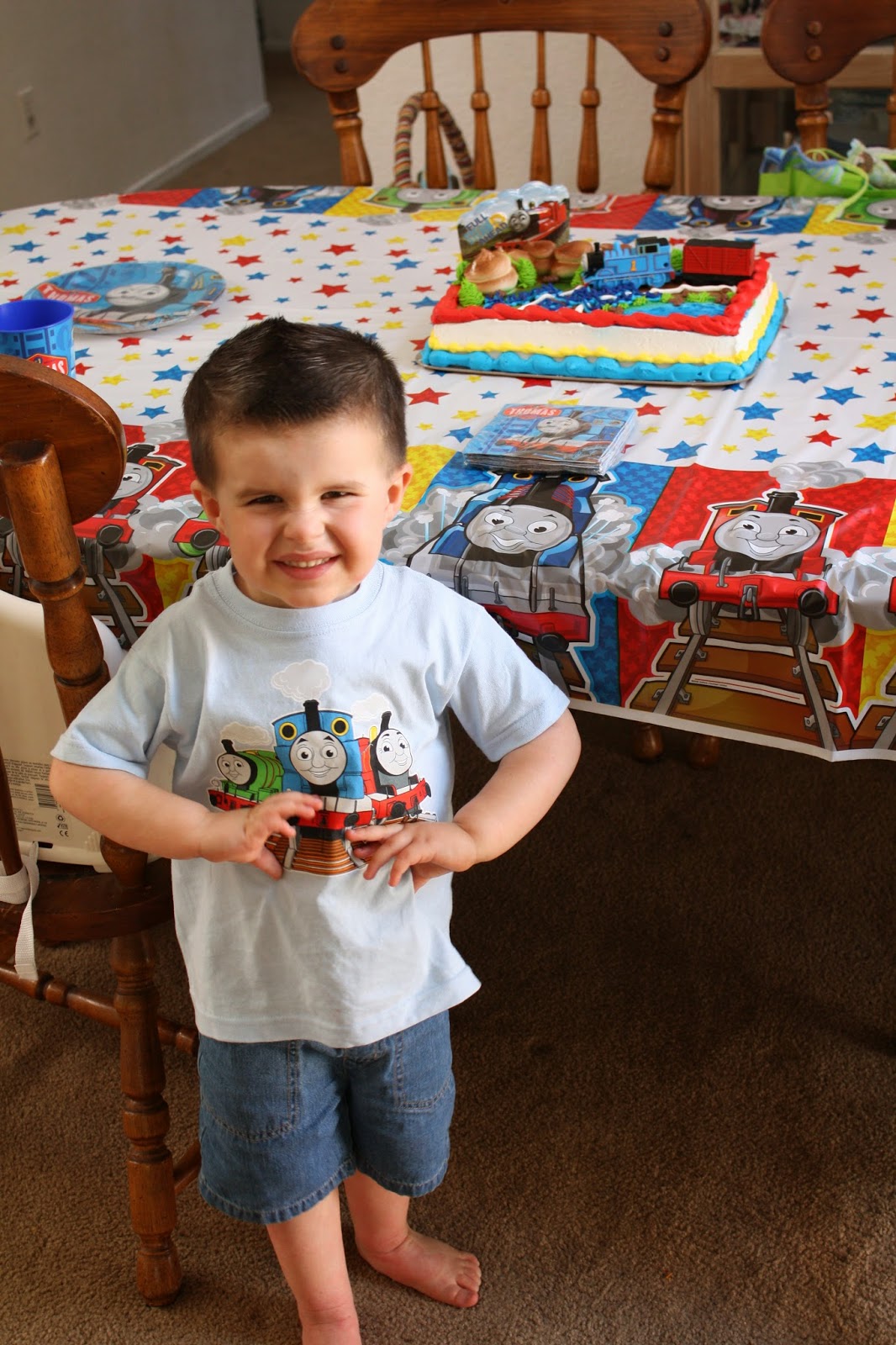 I didn't put up a lot of decorations, but the day before his party, I took him to Party City and let him pick out what he wanted. That next morning when he woke up to the front room decorated, he had the sweetest smile. He took my hand into the front room and pointed out the table cloth, and the Thomas decorations, and was just so excited. He even showed me the gifts I had wrapped for him, and when I told him he had to wait until his party that afternoon to open them, he sweetly said, "Ok Mommy!" I am so grateful for his easy going personality. He just melts my heart!